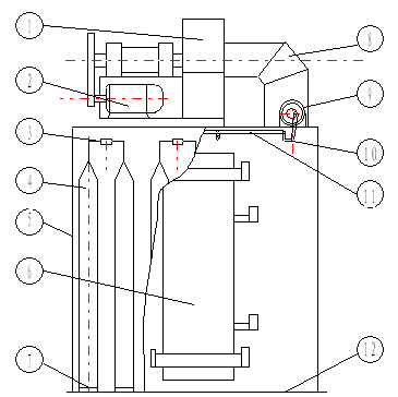 (3)搖動機構包括:⑨搖動用減速電機⑩曲桿,搖動連桿③搖動軸(或稱濾袋懸掛軸);