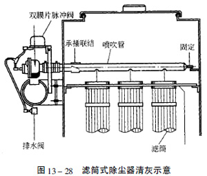 由于濾芯本身是一個硬固體,不再配置骨架,所以濾芯的清灰與傳統(tǒng)的濾袋清灰不同。圖13—28所示是用一個脈沖閥噴吹三個排在一起的濾芯。濾芯的總過濾面積應(yīng)有限制。